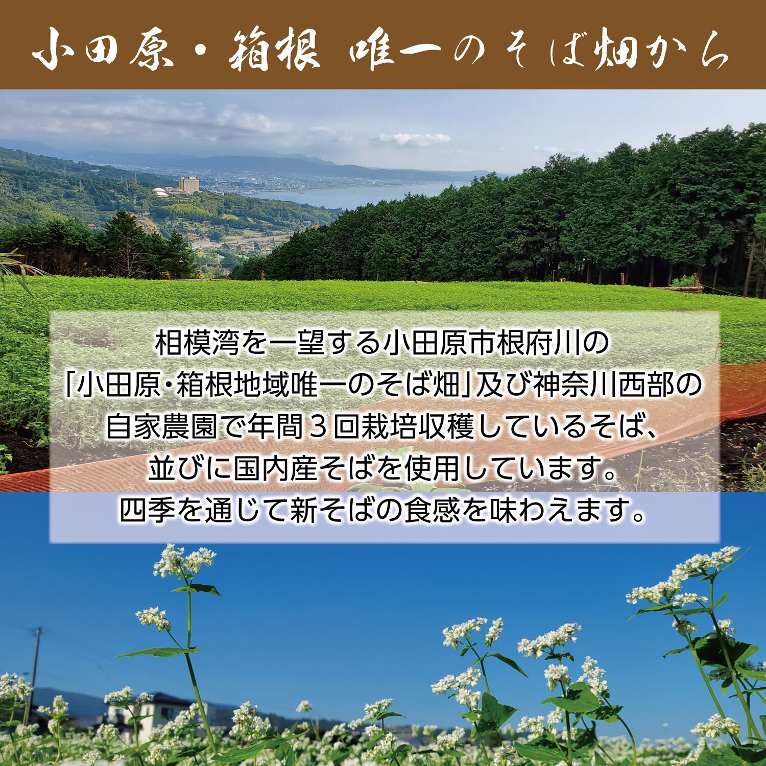 相模湾を一望する小田原市根府川の「小田原・箱根地域唯一のそば畑」及び神奈川西部の自家農園で年間3回栽培収穫しているそば、並びに国内産そばを使用しています。四季を通じて新そばの食感を味わえます。