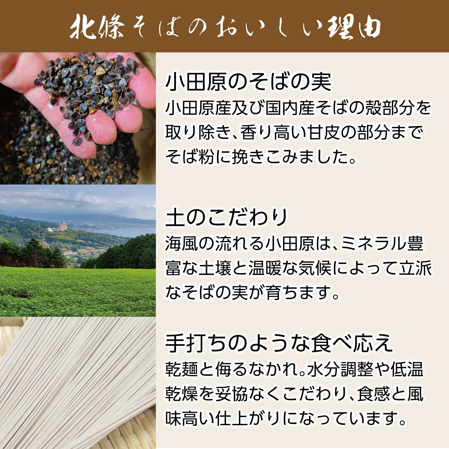 相模湾を一望する小田原市根府川の「小田原・箱根地域唯一のそば畑」及び神奈川西部の自家農園で年間3回栽培収穫しているそば、並びに国内産そばを使用しています。四季を通じて新そばの食感を味わえます。